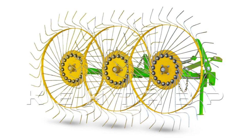 Рабочие колеса граблей имеют диаметр 1,2 метра, они оснащены спицами заводского производства, изготовленными из высокопрочной пружинной стали толщиной 6 мм и окрашены порошковой краской. Диск крепления спиц усилен в сравнении с польскими производителями, имеет толщину 5 мм. Колеса установлены на двух 205 подшипниках, что обеспечивает надежную и длительную эксплуатацию. Усиленная несущая труба граблей с толщиной стенки 3,5 мм придает конструкции дополнительную прочность.